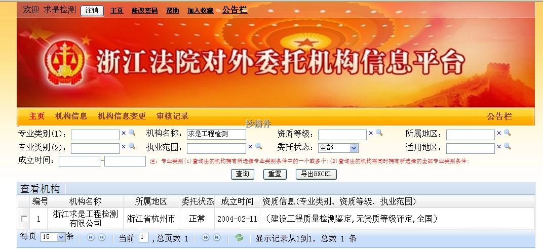 2014年11月,经浙江省高级人民法院审核,公司已录入“浙江法院对外委托机构信息平台”,允许开展“建设工程质量检测鉴定”类的司法鉴定。